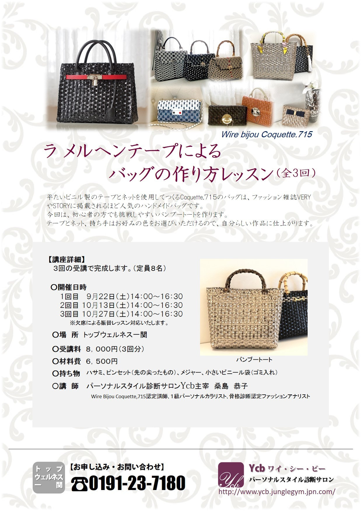 今年は「トップウェルネス一関」で「ラ メルヘンテープによるバッグの作り方レッスン(全3回)」の特別セミナーを開催します!!